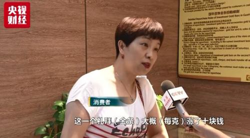 消费者:这一个星期,金条大概每克涨了十元。因为我也炒股票,我的股票一直大跌,看着金条投资还不错,我觉得赶紧买点。