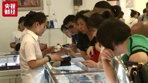 记者在北京最大的黄金珠宝专营卖场菜百商场看到,消费者络绎不绝,多个收银台都排起了等待的顾客,据介绍,近三天客流量增长都在平时的一倍以上,而黄金出货量也是水涨船高,特别是具有投资价值的金条出货量更是平时的四到五倍。