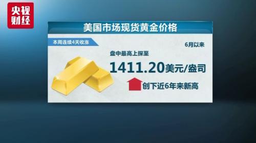 6月以来,国际金价一路攀升,现货黄金本周更是连续4天收涨。美国市场盘中最高上探至1411.20美元/盎司,创下近6年来的新高。