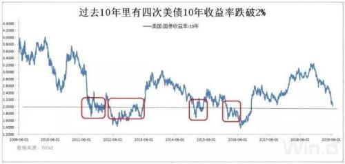 在过去10年的时间里,美债10年收益率一共有4次跌破2%,分别为: