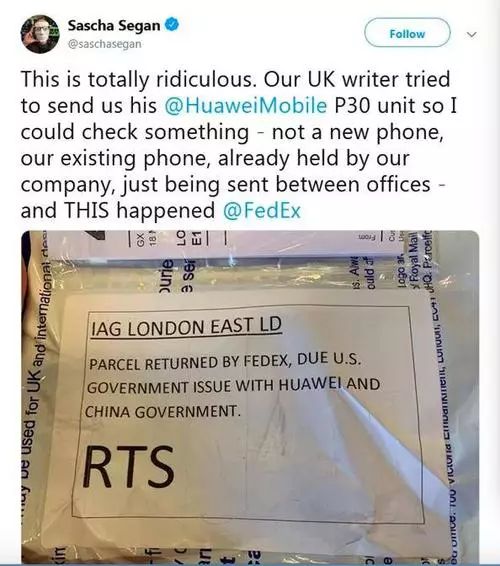 事情的起因,是美国《个人电脑》杂志的工作人员发现他们的英国编辑部寄给美国编辑部用来进行评测的一部华为P30的手机,被美国联邦快递以违反美国政府对华为的禁令为由而退回了。对此,《个人计算机杂志》的一名主管在社交媒体上表示,该事件非常荒谬。该主管写道,“我们邮寄的是一部我们正在使用的手机,只是想在办公室之间进行转移,却在联邦快递发生了这样的事情。”