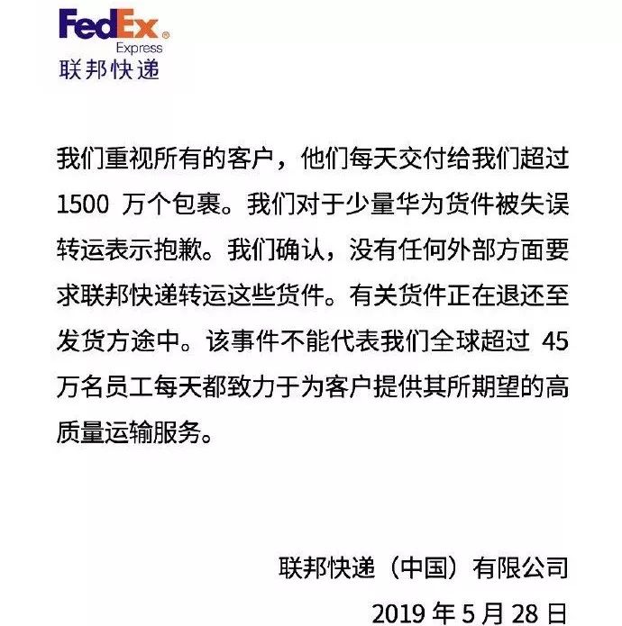 此次已不是联邦快递第一次在涉及华为的快递服务上出现严重问题并因此被投诉了。据路透社28日报道,美国联邦快递在未说明的情况下,将华为的包裹转移到美国。联邦快递随后表示,“对于少量华为货件被失误转运表示抱歉,没有任何外部方面要求联邦快递转运这些货件。”