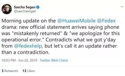 《个人计算机杂志》报道称,联邦快递当时理直气壮地告知发货人,退货原因是由于美国政府和华为公司之间存在问题。不过,就在此事被曝光后,联邦快递又给出了最新声明,道歉说这是一次“操作错误”。
