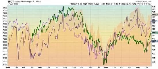 今年,Spotify幸运地拥有了更好的市场前景,2月份最后一周上涨了33%多一点,5月份第二周基本上是左右摇摆。该公司股价在5月份的第三周下跌了8%多一点。现货价格较5月23日反弹不到24%,距年内高点不到2美元,但仍较2018年7月每股196美元的历史高点下跌近23%。截至今日(6月17日)收盘,纳斯达克综合指数(橙色区域)涨幅略低于18%,较6月第一周上涨略低于7%(见上图1)。