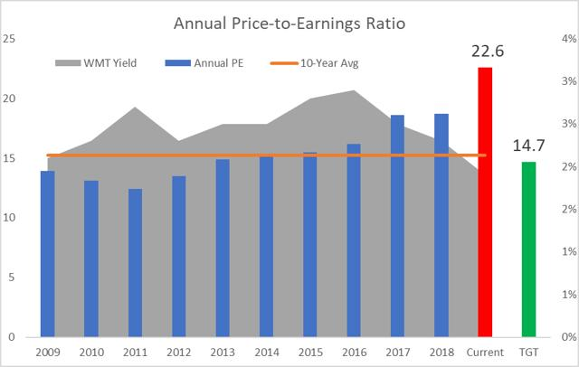 从上图可以看出,公司过去10年的平均市盈率略高于15倍,近两年攀升至近17倍。而目前市盈率达到了22.6倍,高于塔吉特市盈率的50%。而塔吉特正在实现盈利增长,不像沃尔玛那样,以牺牲利润率为代价,花费数十亿美元来提振营收。所以理论上沃尔玛的股价应该低于其长期平均估值,而不是获得50%的溢价。笔者认为该股值得从空头角度看一看。