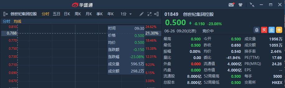 智通财经APP获悉,创世纪集团控股(01849)首日挂牌,截至9时20分,跌23.08%,报价0.50港元,成交额1055万港元。