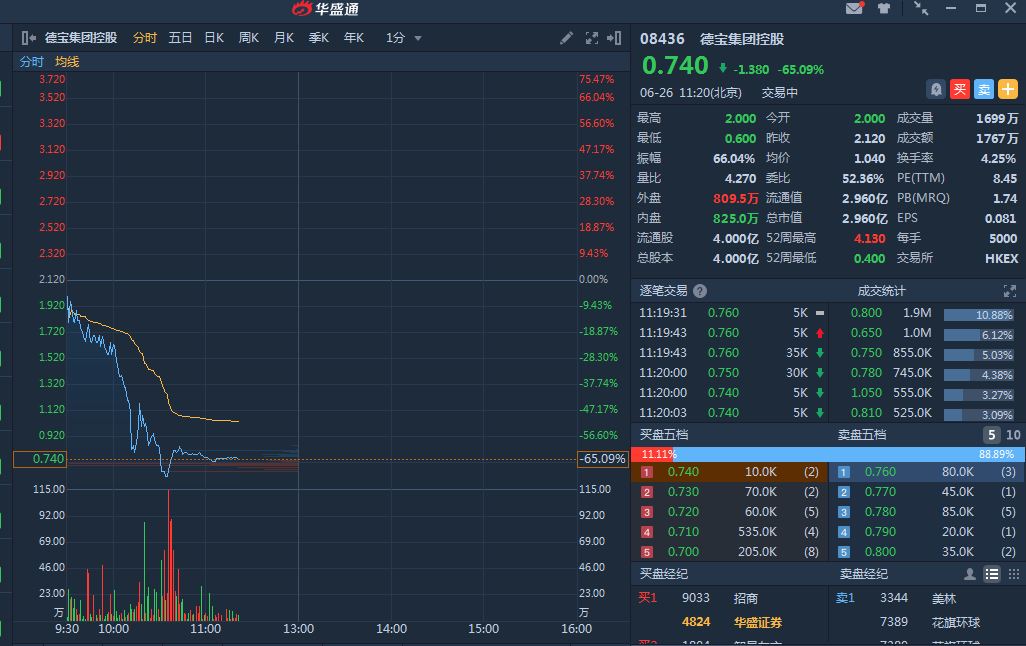 格隆汇6月26日丨继昨日多只细价股出现集体暴跌后,德宝集团控股(8436.HK)今日盘中再现暴跌走势,现报0.74港元,跌65.09%,暂成交1767万港元,最新总市值仅剩2.96亿港元。