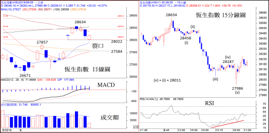 短線而言,恆指由28634頂部下跌至今早的27986,在15分鐘圖上展現五個細浪的下跌結構,其中的(iii)浪屬於延伸浪,所以由28187開始的(v)浪傾向與(i)浪的長度接近,即理論上的見底目標為28011,與今早的實際低位27986僅相差25點。由此估計,恆指短線有機會先出現反彈,若為28634至27986跌幅的0.5及0.618倍,阻力為28310及28386,後者與50天線28370接近。