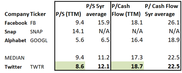 推特的营收保持15%以上的稳定增速,其主要估值倍数和Facebook、谷歌和Snap等同业公司基本处在同一水平,其中市销率还略低于Facebook。
