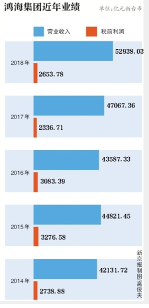 更重要的是,股价低迷和董事长人选匆忙交接的现状,都不及财务业绩上的危机。2016年鸿海营收缩水。另一方面,鸿海税前净利润已连续两年同比下滑。郭台铭曾向股东为2017年净利润下滑道歉,但未能“刹车”,2018年再度同比下滑6.9%。