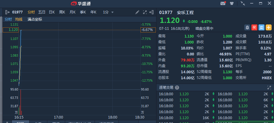 安乐工程(01977)暗盘低开16.67% ,截止发稿,安乐工程(01977)暗盘段报1.12港元,较发行价1.2港元跌6.67%,暂成交188万,最新总市值15.68亿港元。
