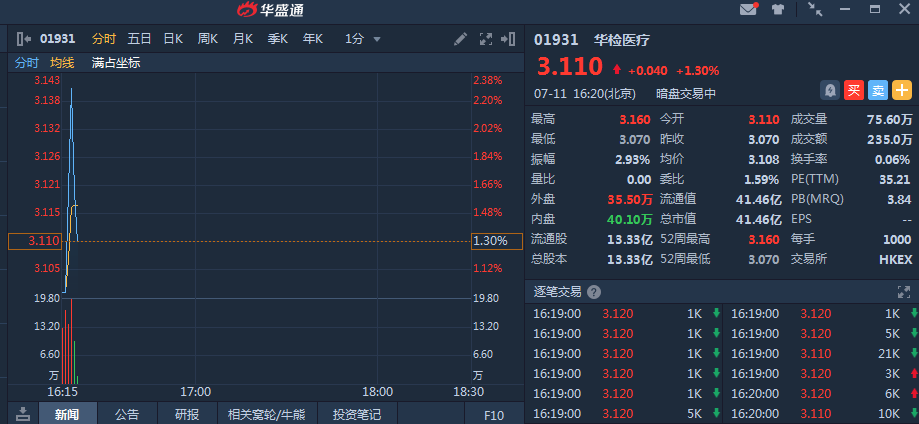 华检医疗(01931)暗盘高开1.3% 一度涨2.28%,截止发稿,华检医疗(01931)暗盘段报3.11港元,较发行价3.07港元升1.3%,暂成交235万,最新总市值41.46亿港元。