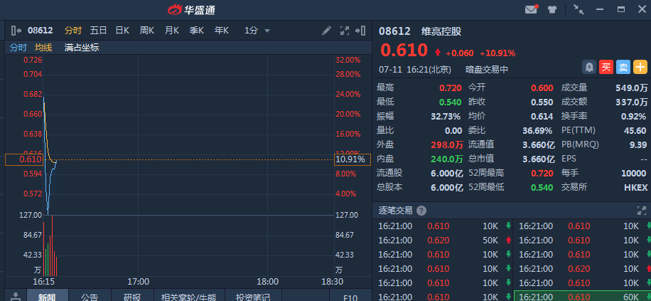 维亮控股(08612)暗盘高开9.09% 一度大涨23.64%,截止发稿,维亮控股(08162)暗盘段报0.61港元,较发行价0.55港元升10.91%,暂成交337万,最新总市值3.66亿港元。