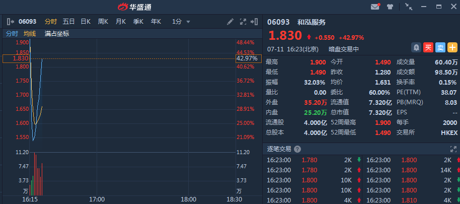 和泓服务(06093)暗盘高开16.4%,一度大涨48.44%,截止发稿,和泓服务(06093)暗盘段报1.83港元,较发行价1.28港元升42.97%,暂成交98.5万,最新总市值7.32亿港元。