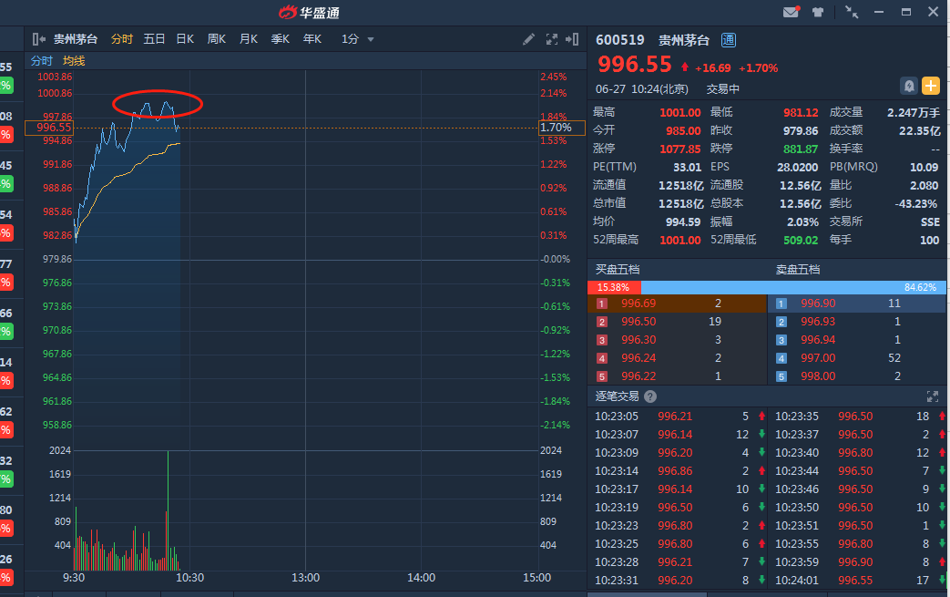 贵州茅台股价突破1000元大关,再创历史新高,今年以来涨幅近70%,市值达1.25万亿。