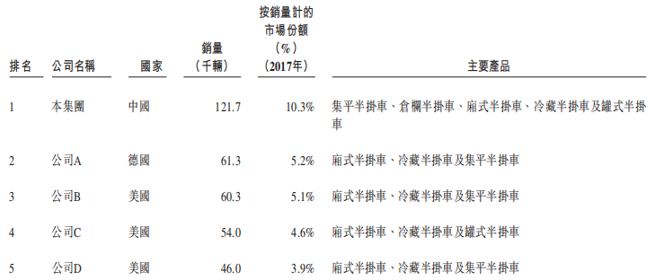 招股文件显示,中集车辆2017年盈利10.12亿元(人民币,下同),同比增长34.37%。2018年盈利12.32亿元,同比增长21.8%。按总销量计算,自2013年起,中集车辆已经连续5年为全球最大的半挂车制造商,按半挂车销量计,公司在中国半挂车行业排名第一,2017年市场份额为15.7%,在全球半挂车制造商中排名前五。
