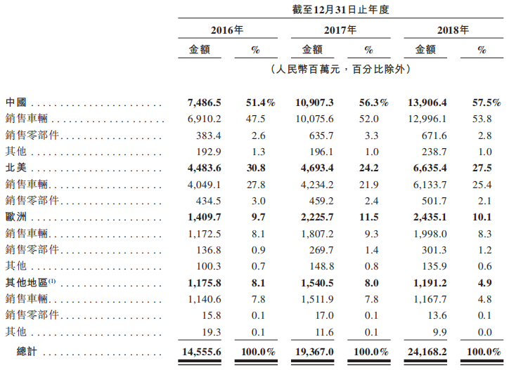 而在国内,公司市场份额占比更大,2017年按销量计,市场份额为15.7%,而第二名仅为4.5%。在北美市场份额则排名第五,为11.4%,前四家市场份额占比依次为16.5%、14.8%、12.6%及11.9%,占比相对比较接近。而在欧洲市场,公司市场占比较低,前五大公司销量为146800辆,市场份额占比总共为62.9%,而公司销量为8385辆,市场份额仅为3.59%。