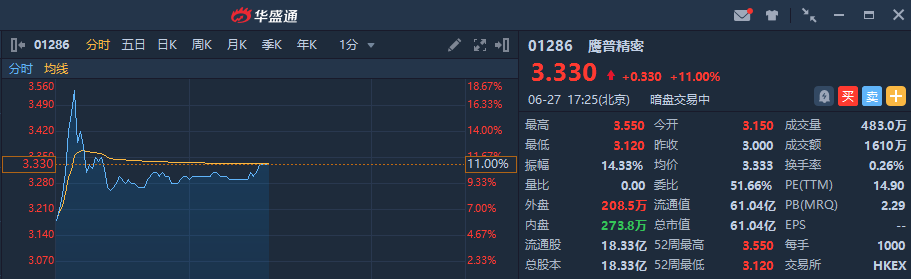 鹰普精密(1286.HK)暗盘高开5%,一度大涨18.33%。截止17时25分,报3.33港元,暂成交1610万港元,最新总市值61.04亿港元。