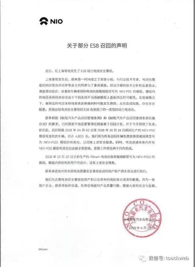 自2019年6月27日起,召回部分搭载了2018年4月2日到2018年10月19日期间生产的动力电池包的蔚来 ES8电动汽车,共计4803辆。
