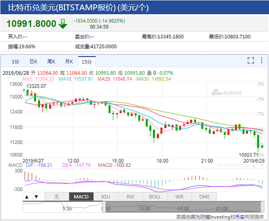 新浪美股讯 Bitstamp数据显示,比特币回落至11000美元下方,最低触及10803.71美元,日内当前下跌1800美元或14.20%,6月26日曾走高至13880美元。