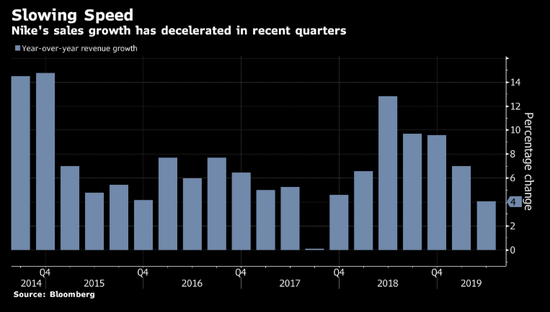耐克的增长在2017年一度陷入停滞,但在过去两年中又回到了正轨。不过,其增长速度一直在放缓。