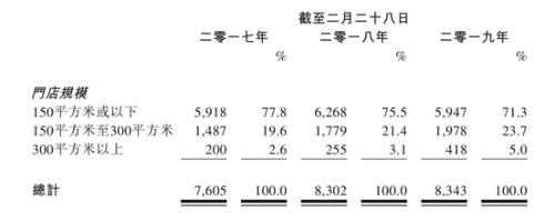 截至2017年、2018年及2019年2月28日止年度的门店总销售面积分別增加了13.0%、11.4%和9.3%。从门店规模的角度来看,大型门店会覆盖更加多元化的产品组合及更高的人员配置,进而此类门店的单店销售额在所有门店中处于较高水准。