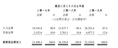 截至2017年、2018年及2019年2月28日止年度,主力品牌货品销售分別占销售货品收入总额的90.0%、89.4%和87.4%。