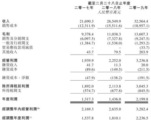 从财务表现来看,截至2017年、2018年和2019年2月28日止年度,滔搏运动的总收入分别为216.9亿、265.5亿、325.6亿元人民币,毛利分别为93.8亿、110.4亿、136.1亿元人民币,经调整年利润则分别为153.8亿、181.0亿、223.7亿元人民币。