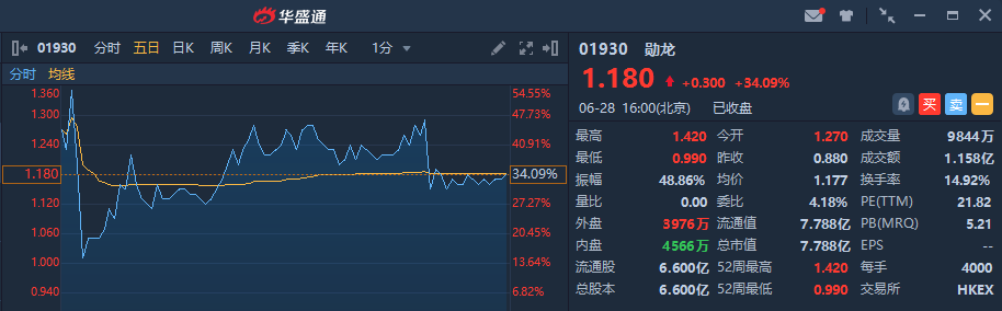 1、勋龙(01930)首日挂牌港交所。截止收盘,收涨34.09%,报价1.18港元,若发行价买入,一手赚1200港元,成交额1.158亿港元,市值达7.788亿港元。