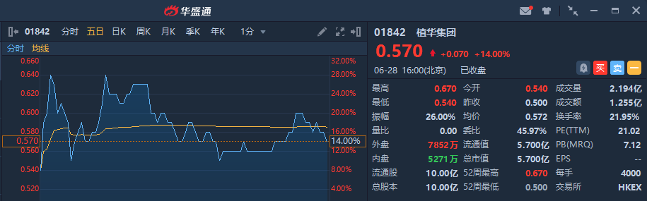 2、植华集团(01842)首日挂牌港交所。截止收盘,收涨14.00%,报价0.57港元,若发行价买入,一手赚280港元,成交额1.255亿港元,市值达5.7亿港元。