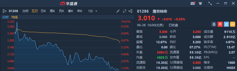 3、鹰普精密(01286)首日挂牌港交所。截止收盘,收涨0.33%,报价3.01港元,若发行价买入,一手赚10港元,成交额2.918亿港元,市值达55.18亿港元。