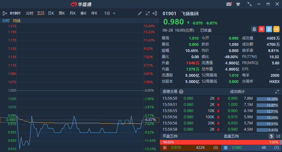 4、飞扬集团(01901)首日挂牌港交所。截止收盘,收跌6.67%,报价0.98港元,若发行价买入,一手蚀140港元,成交额4708万港元,市值达4.9亿港元。