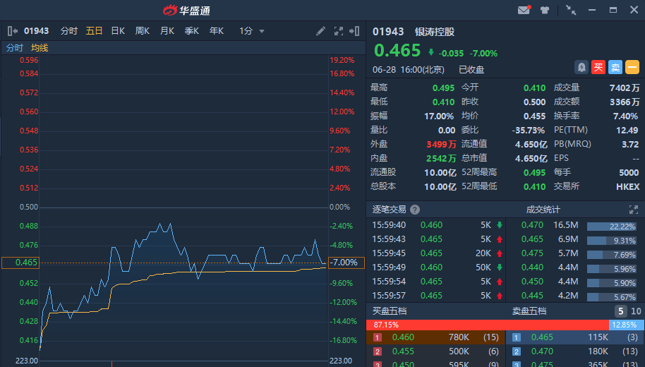 5、银涛控股(01943)首日挂牌港交所。截止收盘,收跌7.00%,报价0.465港元,若发行价买入,一手蚀175港元,成交额3366万港元,市值达4.65亿港元。