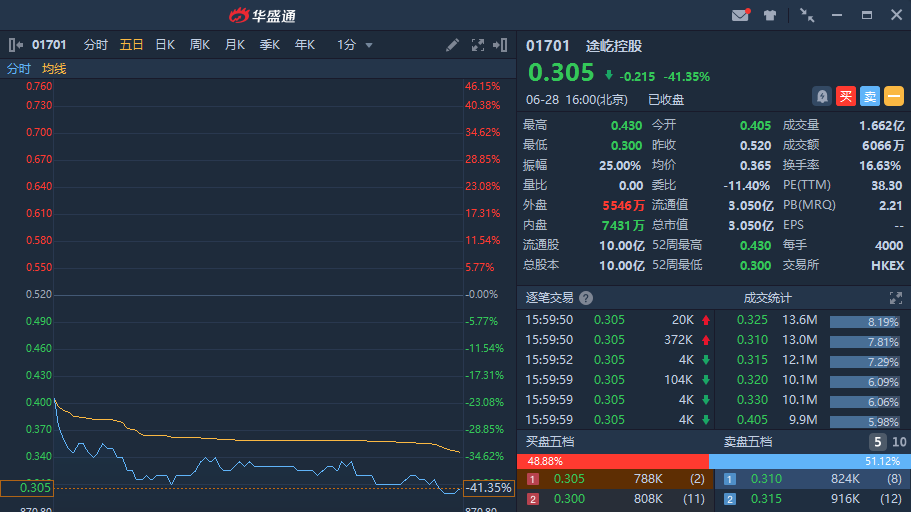 6、途屹控股(01701)首日挂牌港交所。截止收盘,收跌41.35%,报价0.305港元,若发行价买入,一手蚀860港元,成交额6066万港元,市值达3.05亿港元。