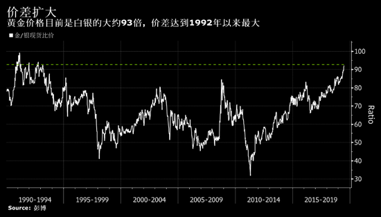 金银比价在周五扩大至大约93,进一步接近1991年2月达到的历史高点100。具有讽刺意味的是,这两种贵金属的价格都在受到全球经济增长疲软的推动,白银因为它被用于工业流程,而黄金因为全球央行正在通过转向更加温和的立场来对经济前景做出反应。