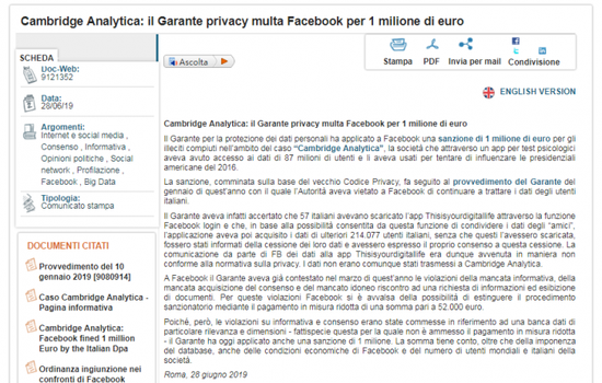 去年的报道指出,臭名昭著的剑桥分析公司丑闻影响了全球8700万人。Garante Privacy 发布的新闻稿称,其中约有214077名意大利用户受此影响。意大利监管机构还指责数据分析公司试图通过使用Facebook非法获取的数据来影响2016年美国总统大选的结果。