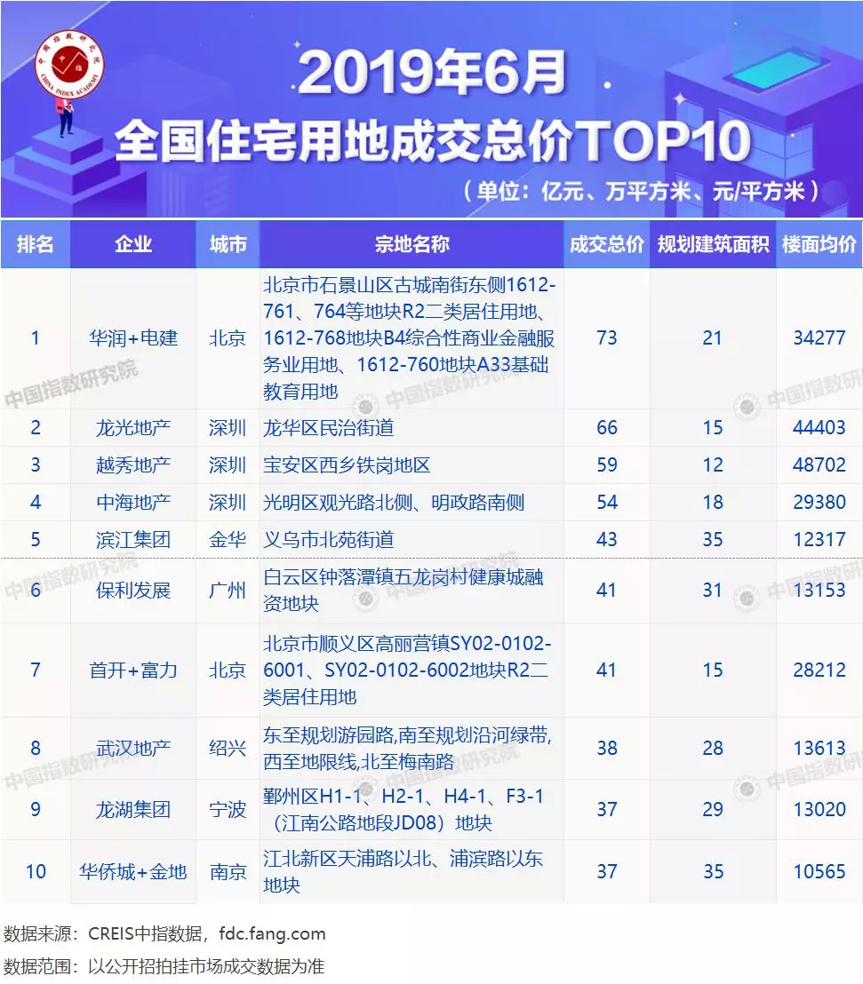 从6月全国住宅用地成交总价TOP10的拿地房企来看,国企拿地占比较大。入榜地块中,共有6宗由国企参与竞得,占TOP10拿地总额的58%。从拿地方式来看,国企偏向合作拿地,如华润+电建联合体以73亿元夺得京土整储板(石)[2019]012号地块,拿地金额居榜单首位,国企拿地优势凸显(以上地块均可到CREIS中指地主产品中查询,详情请扫描上方二维码)。