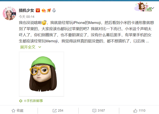 今日凌晨,“搞机少女”发文回应称小米这个声明太吓人了,并希望网友别再圈她了,也不要阴谋论了,没有什么幕后黑手,这样真的挺没劲的,以后好好用苹果吧。