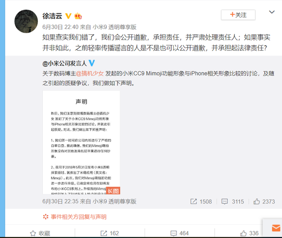 随后,小米集团公关部总经理徐洁云转发声明并评论表示:如果查实我们错了,我们会公开道歉,承担责任,并严肃处理责任人;如果事实并非如此,之前轻率传播谣言的人是不是也可以公开道歉,并承担起法律责任?