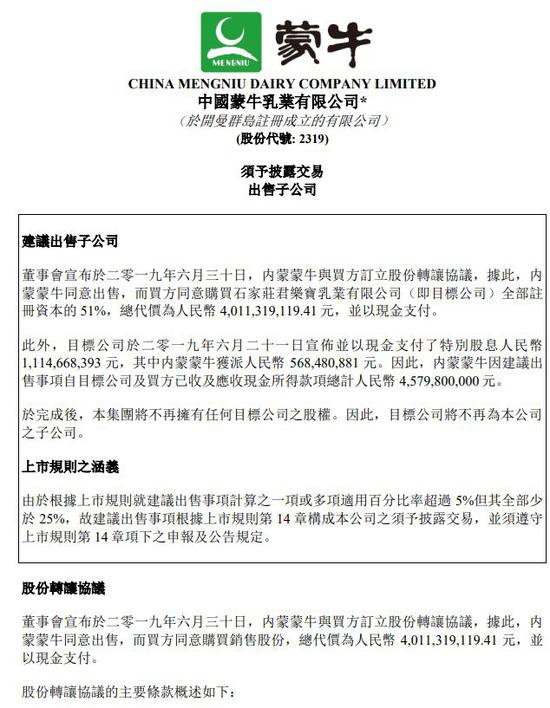 公告显示,蒙牛与买方鹏海基金及君乾管理于2019年6月30日签订股份转让协议,以现金支付的方式,出售了所持君乐宝的所有股权,其中,鹏海基金将持有君乐宝26.6994%的股份,君乾管理则持有24.3006%股权。