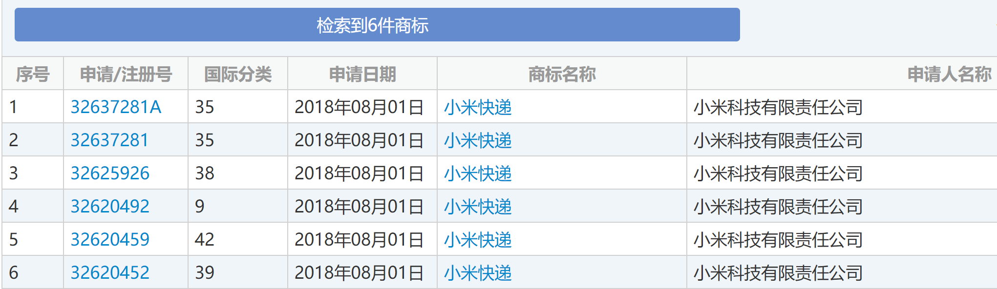 7月1日下午,新京报记者在中国商标网上查询到“小米快递”商标的6件申请,类别包括第9、35、38、39、42五个类别。据悉,小米公司2015年申请的与快递单号识别相关的两项专利,分别在2018年6月和2019年3月核准授权。