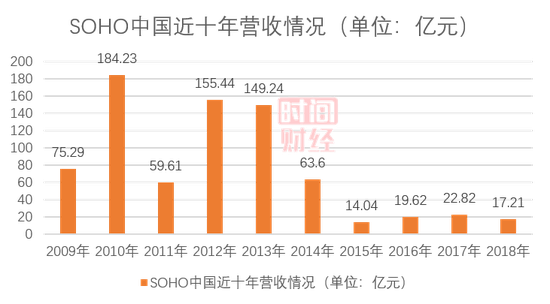 时间财经查阅SOHO中国历年财报发现,自2012年公司进行业务转型以来,营收几乎逐年下降,峰值出现在2010年,当年营收达到182.15亿,至2014年后,SOHO中国营收再度跌破百亿,近几年持续在20亿元左右徘徊。