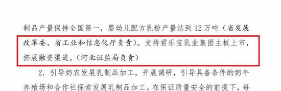 2019年4月12日,河北省发布《2019年河北省乳业振兴方案》,方案称将“支持君乐宝乳业集团主板上市,拓展融资渠道。”并明确此事由河北省证监局负责。