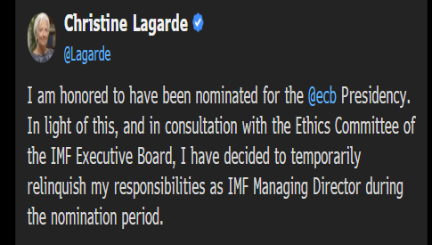如果提名获得确认,拉加德将成为欧洲央行历史上首位女性行长。她发表推文称,“我很荣幸获得欧洲央行行长提名。有鉴于此,经过与IMF执行理事会道德委员会的讨论,我决定在提名期间不再承担IMF总裁职责”。