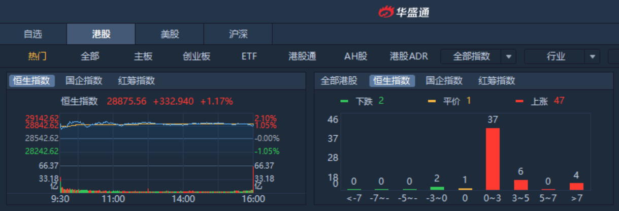 周二,恒指早盘跳空高开1.35%,再度站上60日线,盘中创下5月8日以来新高。截至收盘,恒生指数涨1.17%,报28875.56点,全日成交额达1123.8亿。国企指数涨0.91%,报10981.23点,红筹指数涨1.31%,报4504.49点。