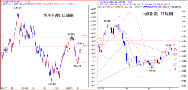 A股方面,昨日上證指數高見3048之後今早已掉頭下跌近30點,高位同時遇上了下跌裂口頂阻力3050及3288至2822跌幅的0.5倍反彈阻力位3055。再者,假如今日最終以較長的陰燭低收的話,日線圖上更會呈現「黃昏之星」,屆時見頂的訊號就更為強烈。
