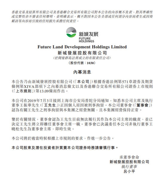 新浪财经讯 7月3日消息,新城发展控股港交所公告:董事会认为王先生目前无法履行其作为本公司主席的职责,并已决定王先生将立即离任董事会主席一职。董事会已决议委任本公司非执行董事王晓松先生为董事会主席,即时生效。