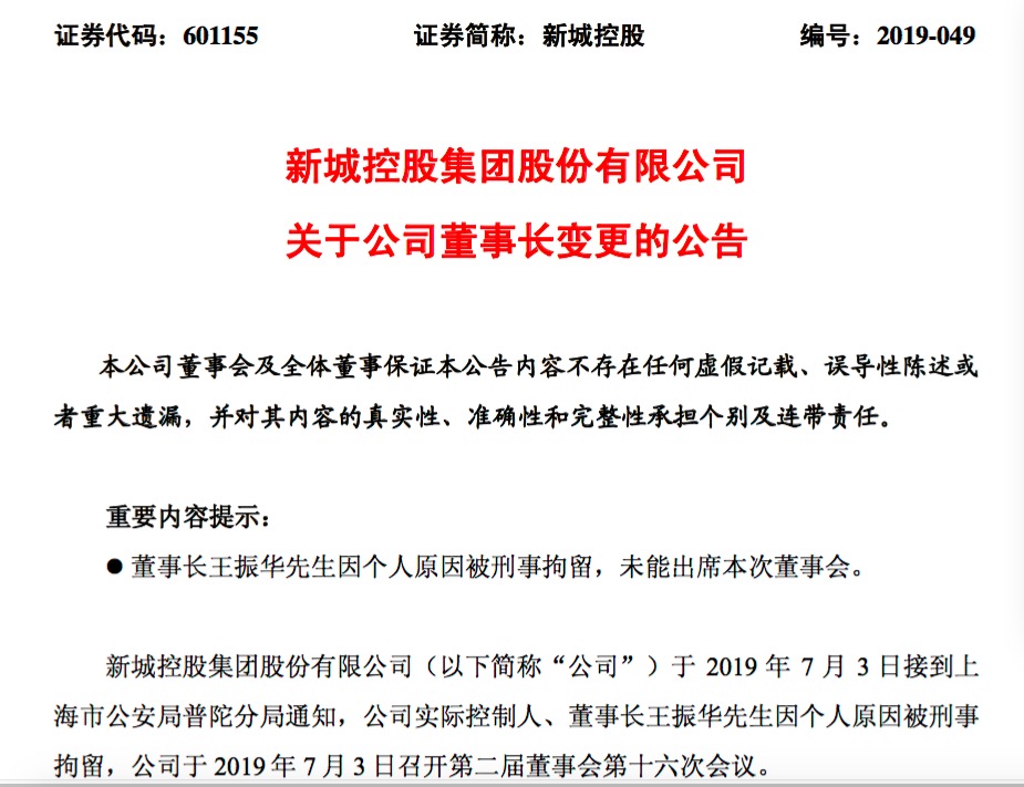 原标题:新城控股连夜发公告:王振华因个人原因被刑拘 其子王晓松任职董事长