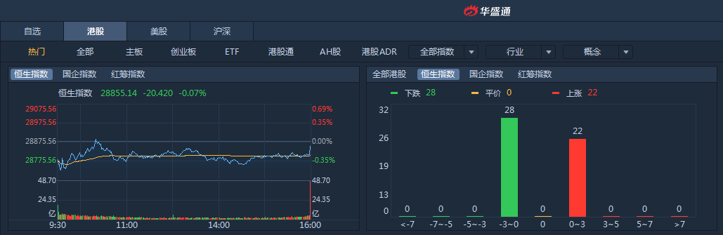 周三, 恒指早盘低开,全天维持窄幅震荡,市场情绪较昨日降温。截至收盘,恒生指数跌0.07%,报28855.14点,全日成交额达804.43亿。国企指数跌0.54%,报10922.41点,红筹指数跌0.09%,报4500.48点。