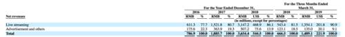更新后的招股书显示,2019年第一季度的营收为14.891亿元人民币,同比增长123%;其中,直播业务营收达到13.541亿元,与2018年同期相比增长149.19%;广告及其他收入为1.35亿元,在总营收中的占比为9.1%,首次跌破10%。